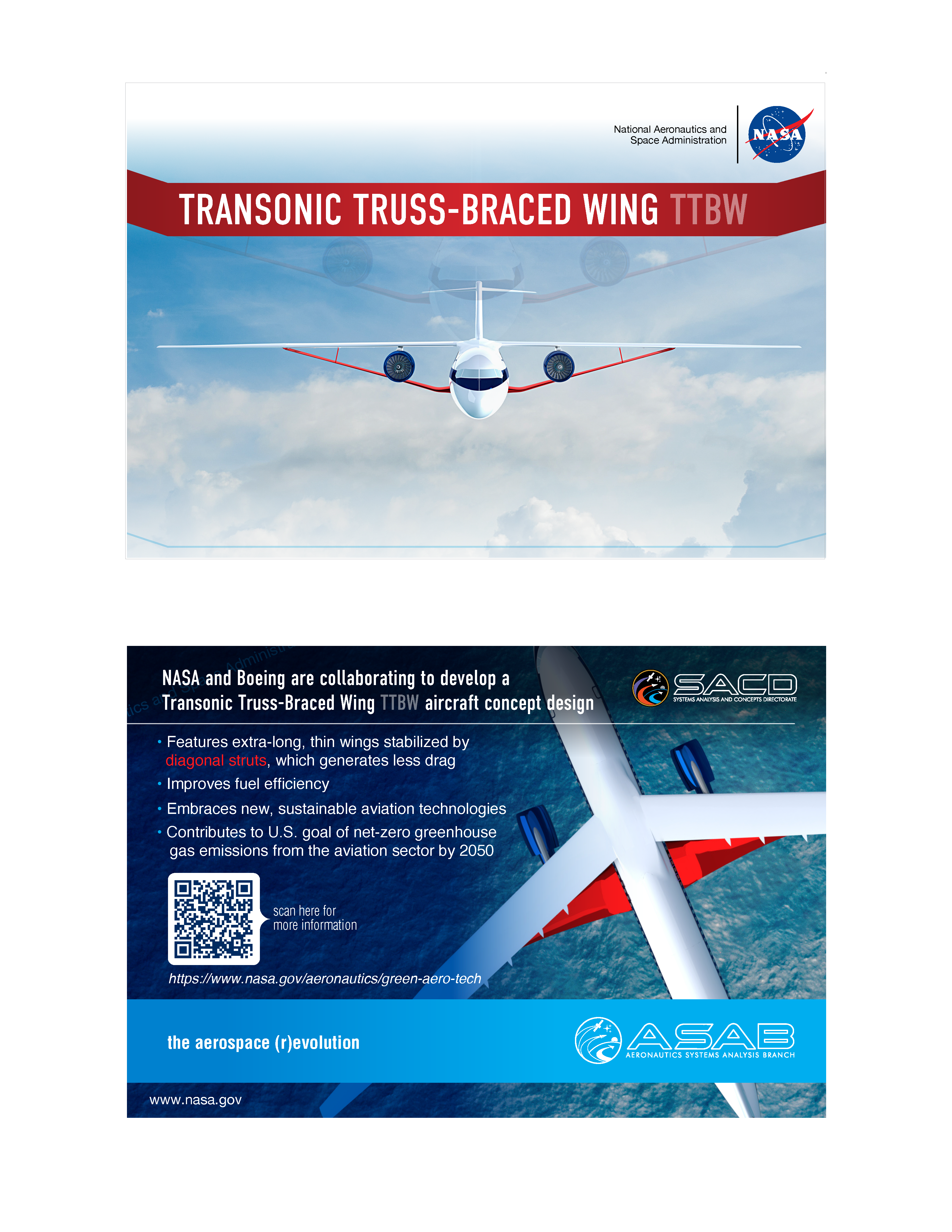 Marketing materials for NASA-Boeing collaboration on sustainable aviation technology. Clean design communicating complex aeronautical engineering concepts with accessible visual storytelling.