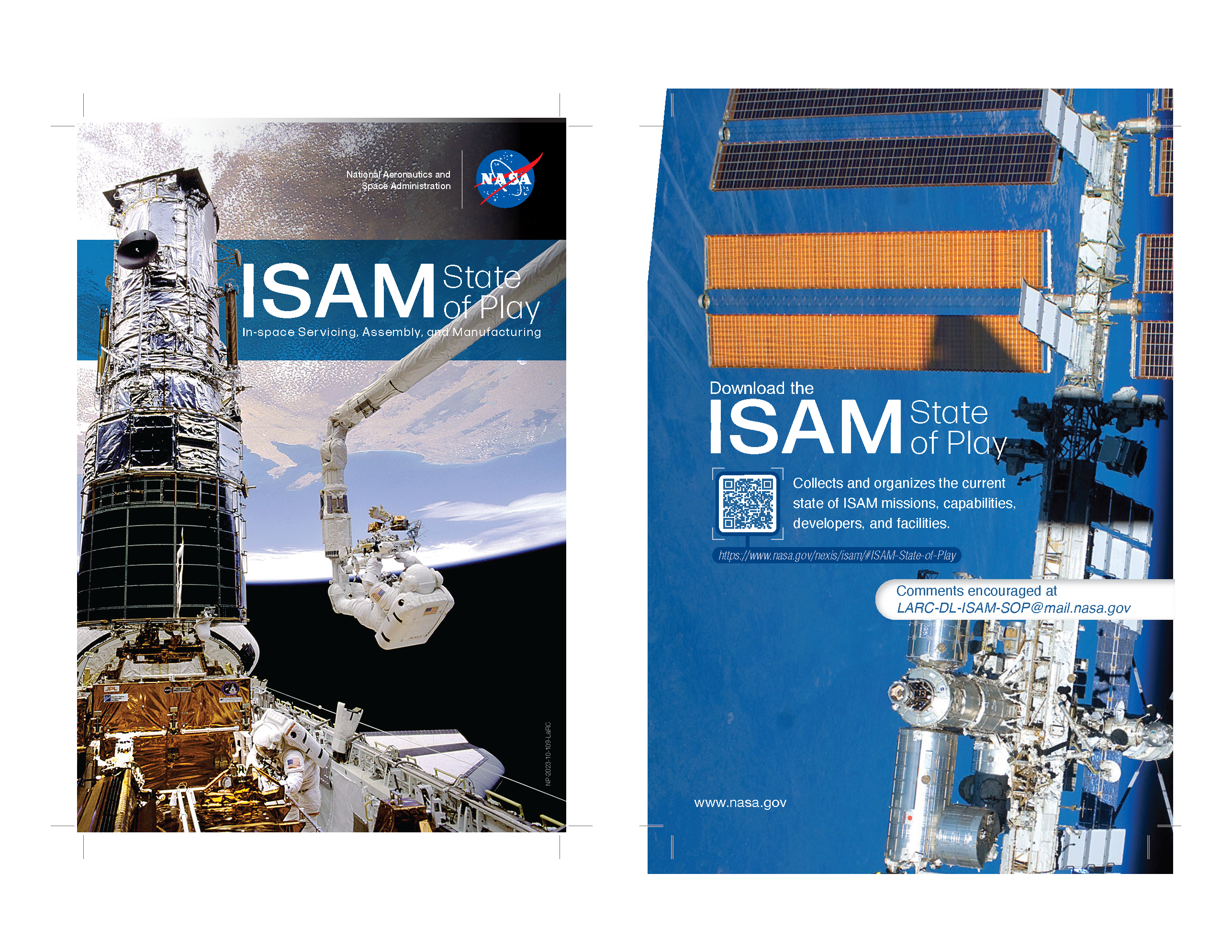 Dual-sided rack card promoting NASA's In-Space Servicing, Assembly, and Manufacturing program. Features stunning space photography and QR codes for digital engagement.
